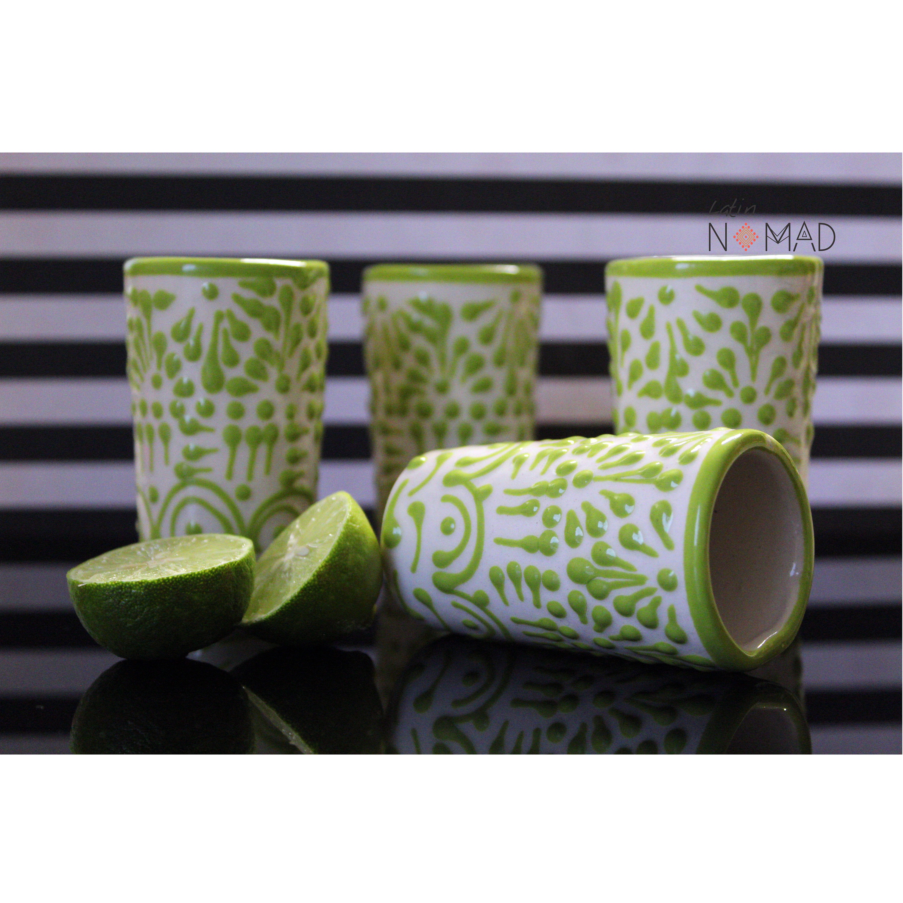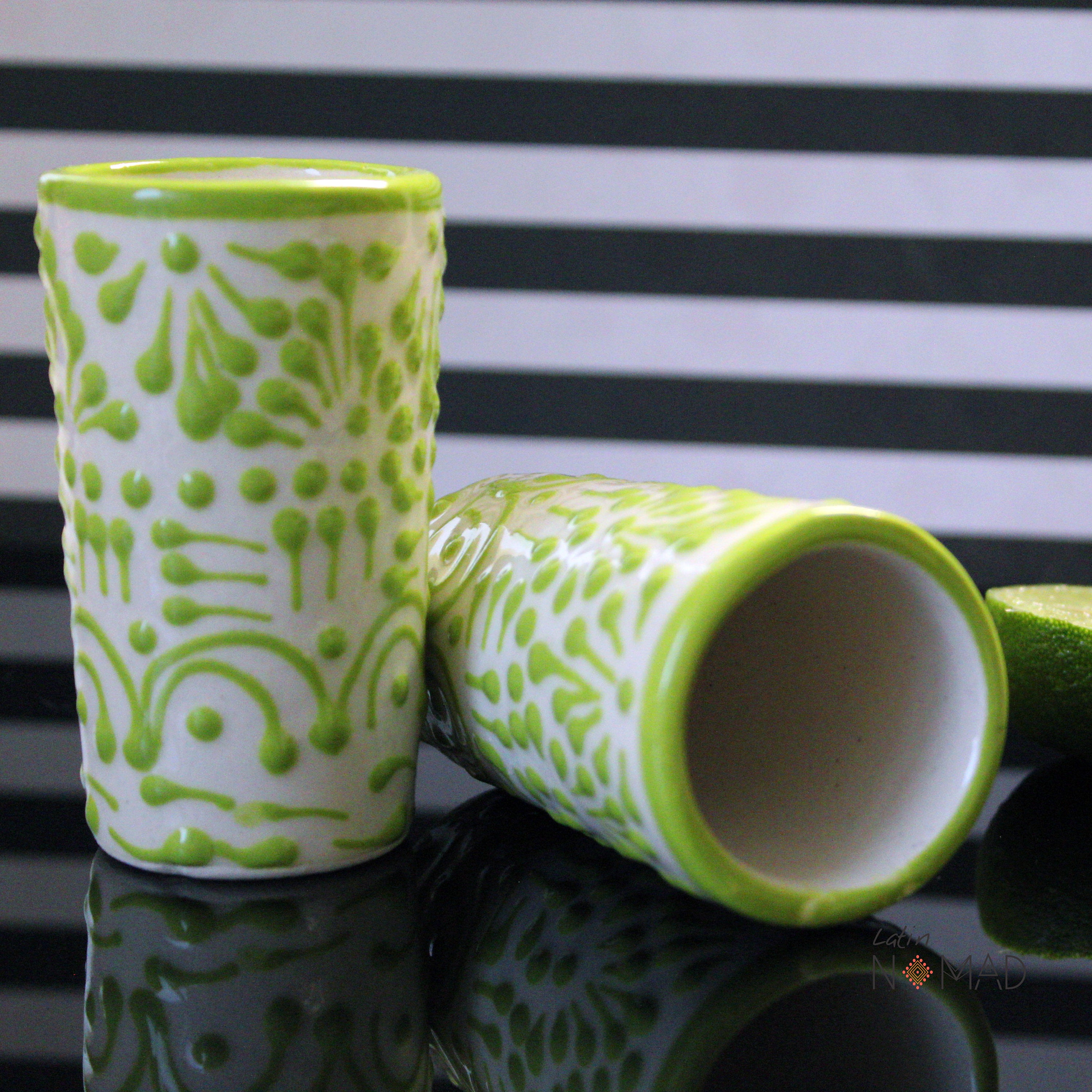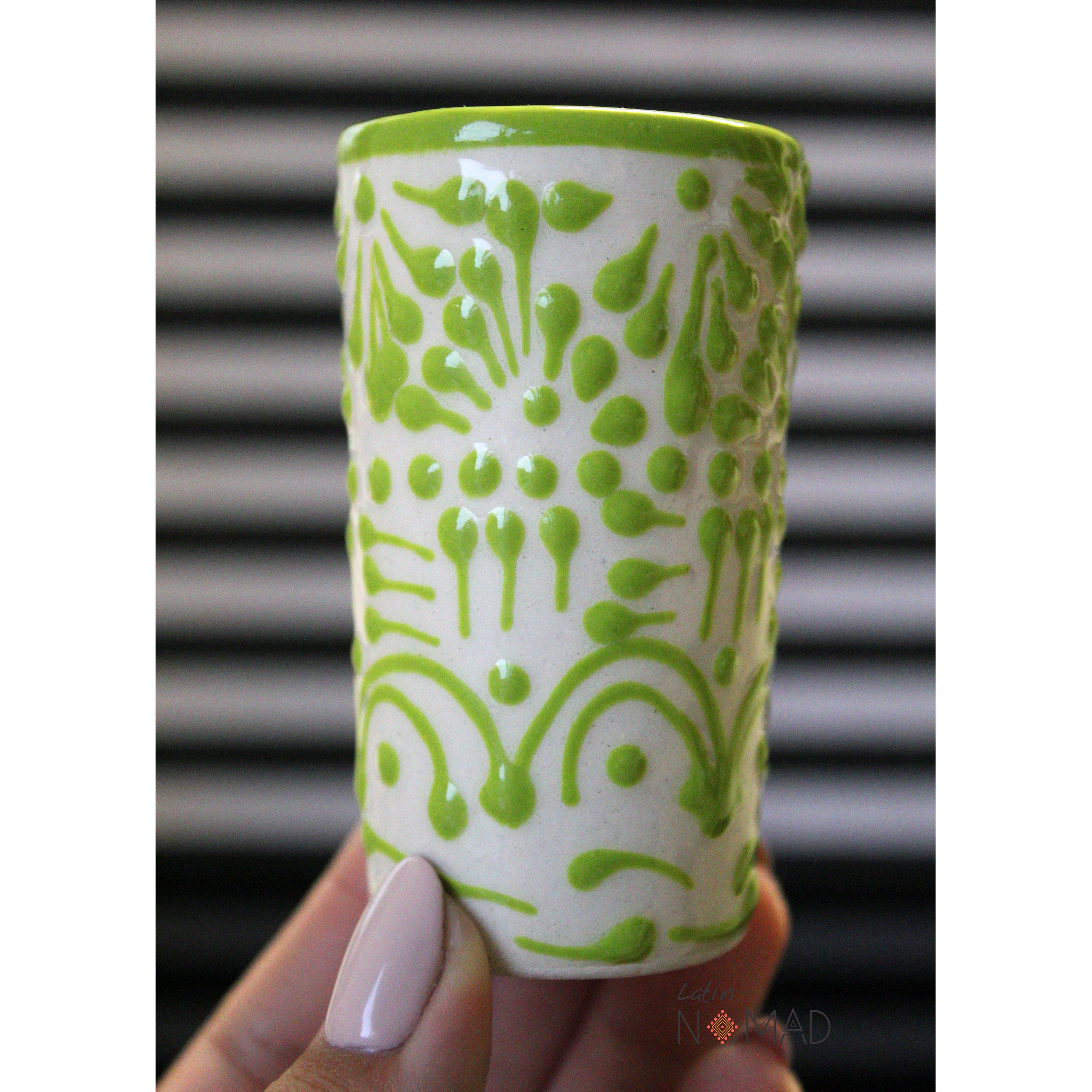 Ceramic Talavera Tequila Shot Glass/ Lime Green and White Mexican Drinkware by Latin Nomad