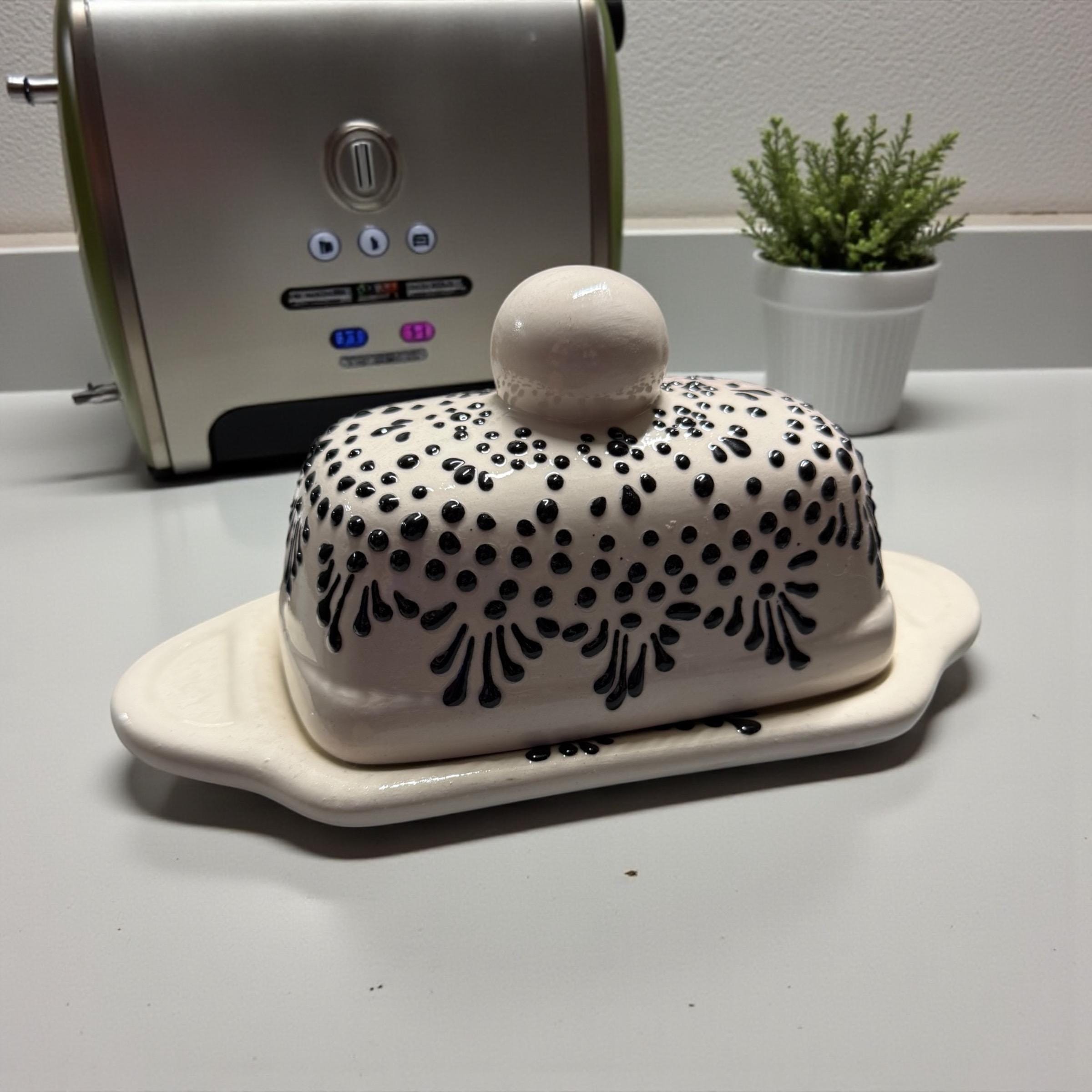 This unique and eye-catching butter dish is a true work of art, combining different design elements to create a stunning visual display at your table.