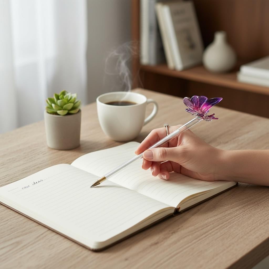 This pen is handcrafted with a decorative glass motiff at the top of the pen, perfect for any gift ocassion or as an eye candy for your desk. Pen design doesn't come with a plastic or glass cap.