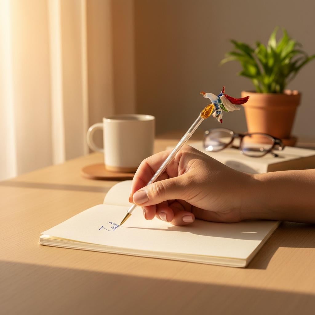 This pen is handcrafted with a decorative glass motiff at the top of the pen, perfect for any gift ocassion or as an eye candy for your desk. Pen design doesn't come with a plastic or glass cap.