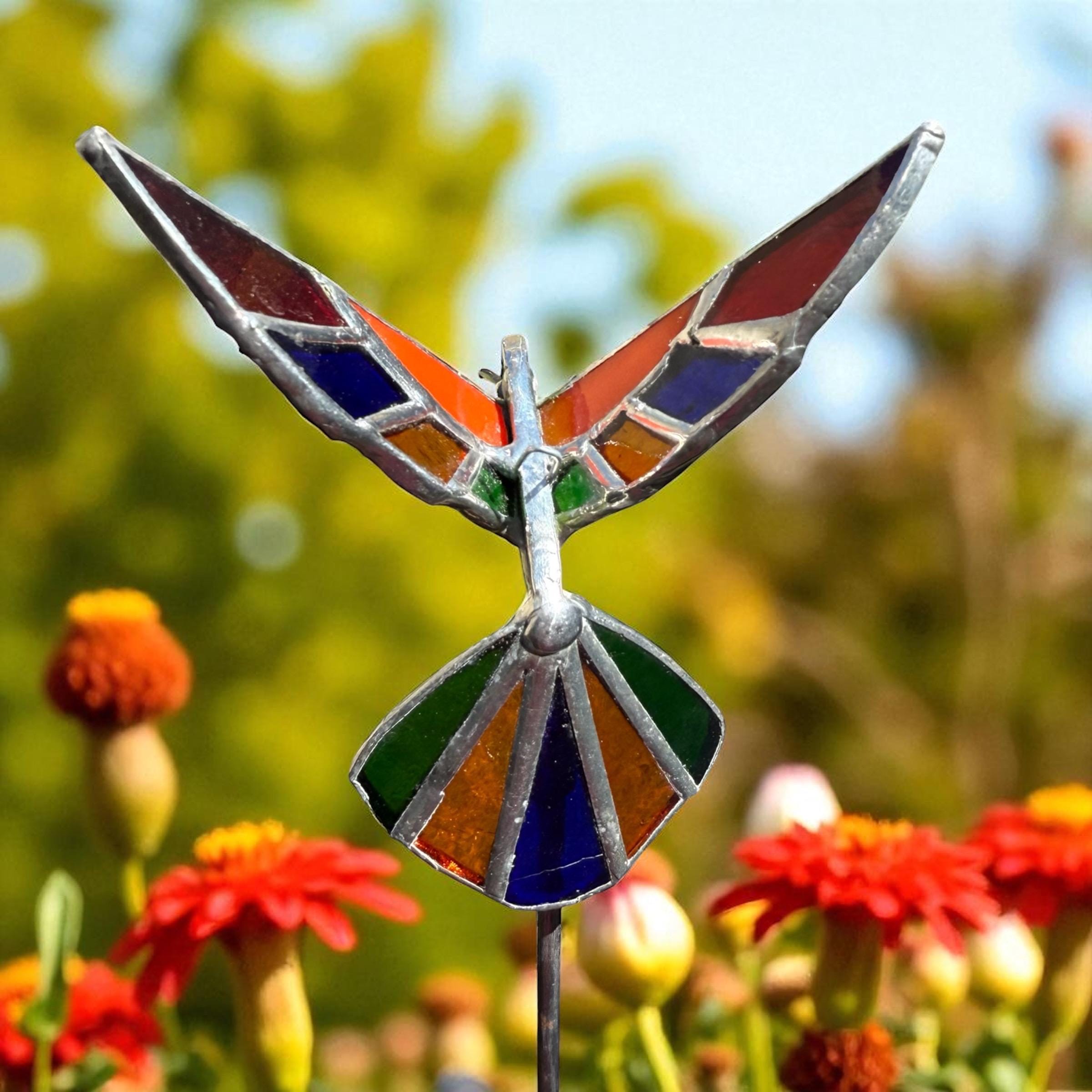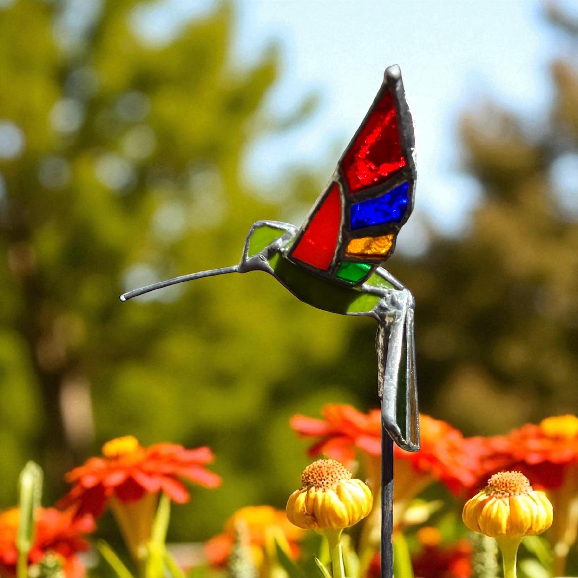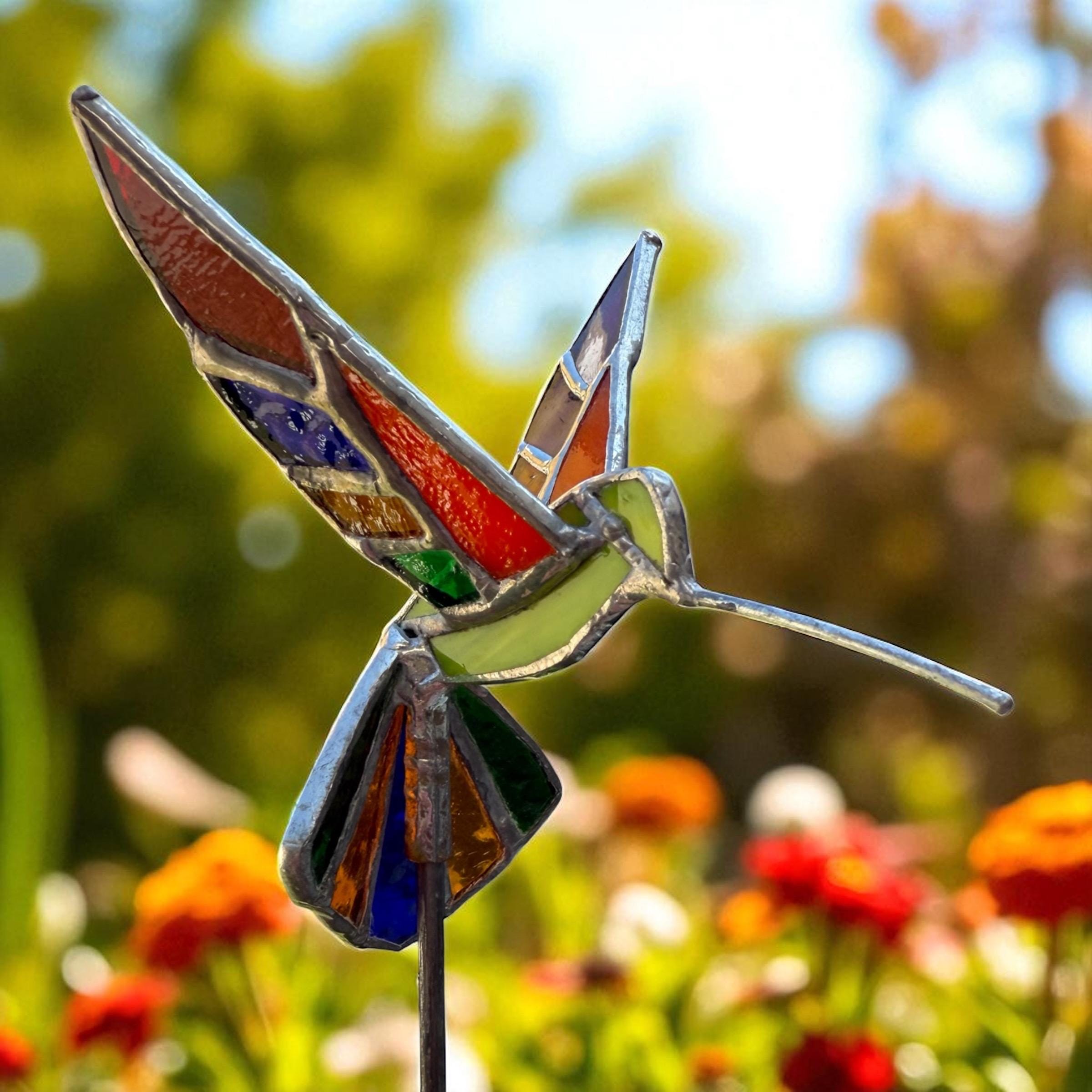 Stained glass lime green hummingbird with multicolor wing and tail accents, beautifully grafted!