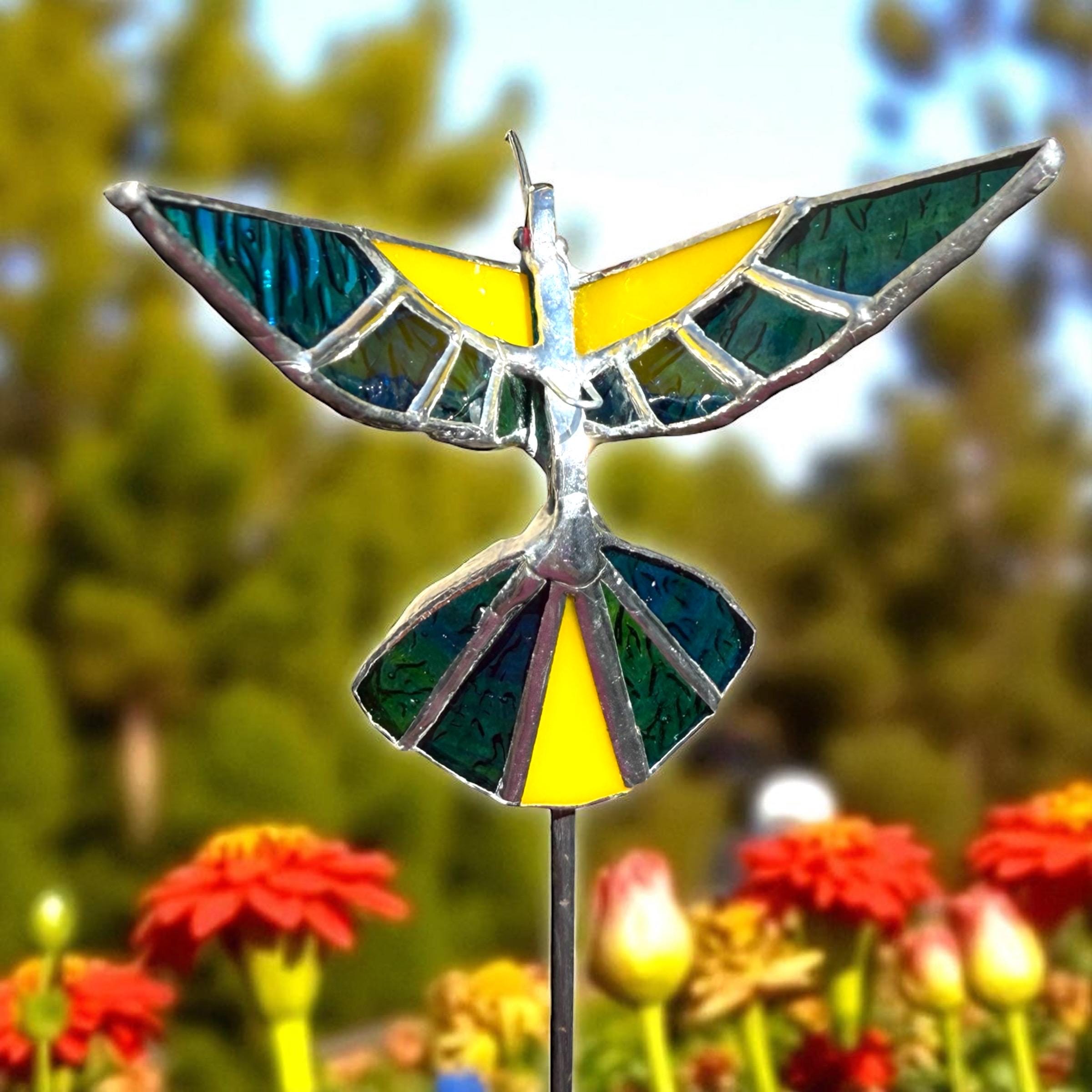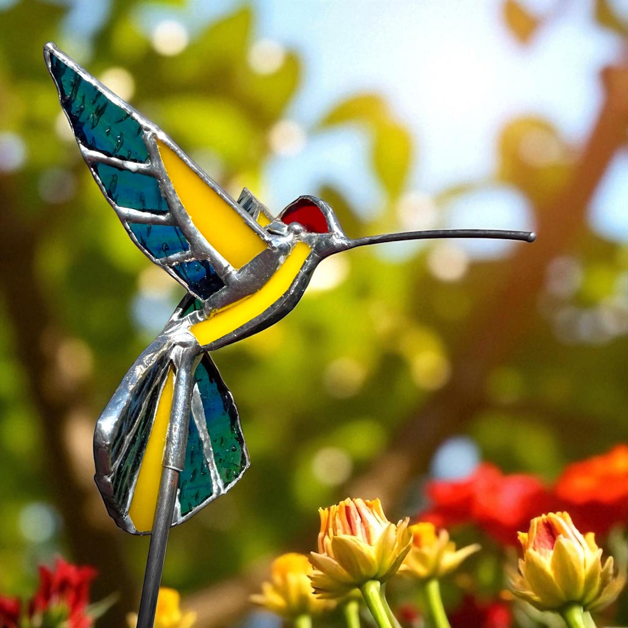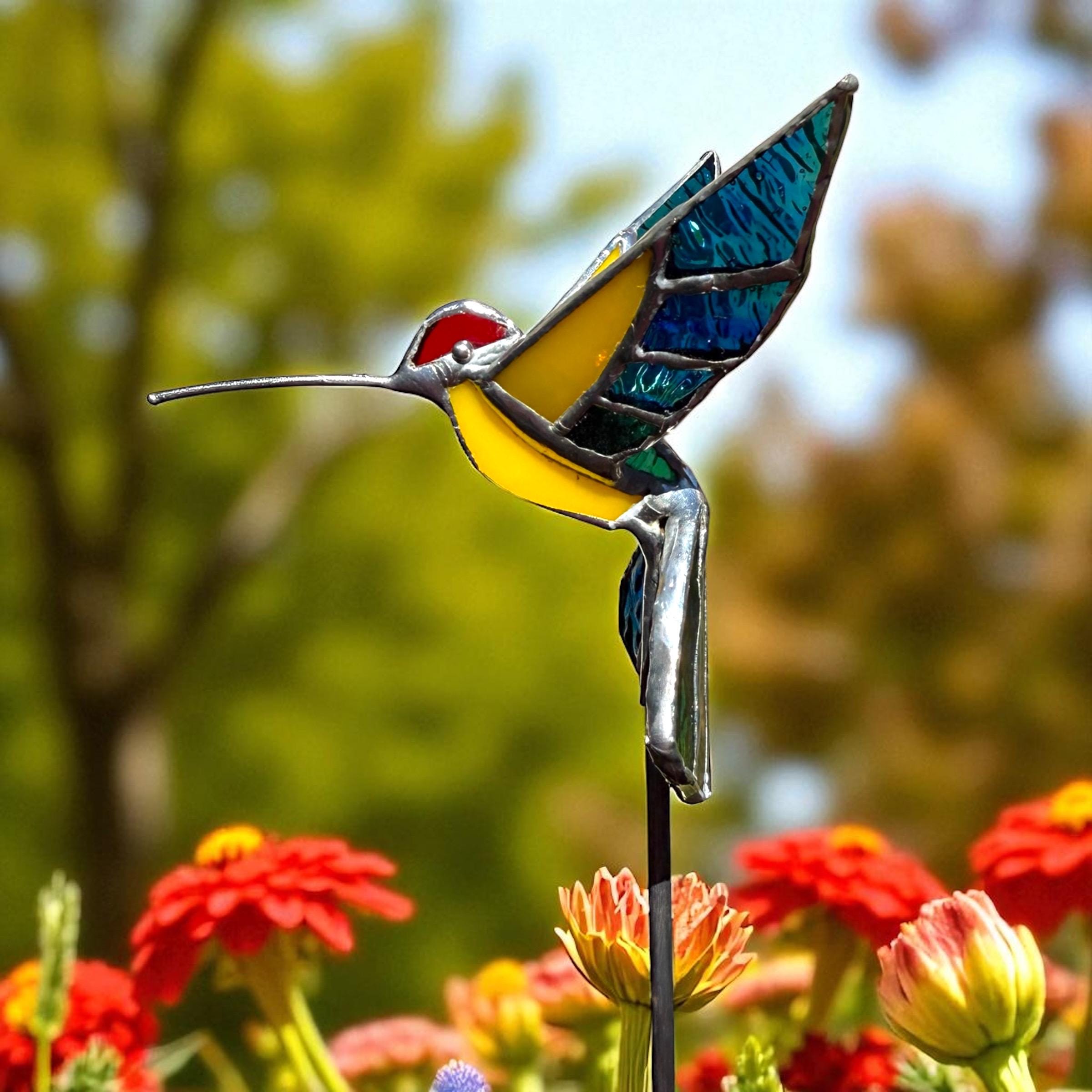Stained glass hummingbird with red head, blue - teal and yellow wing and tail accents, beautifully grafted!