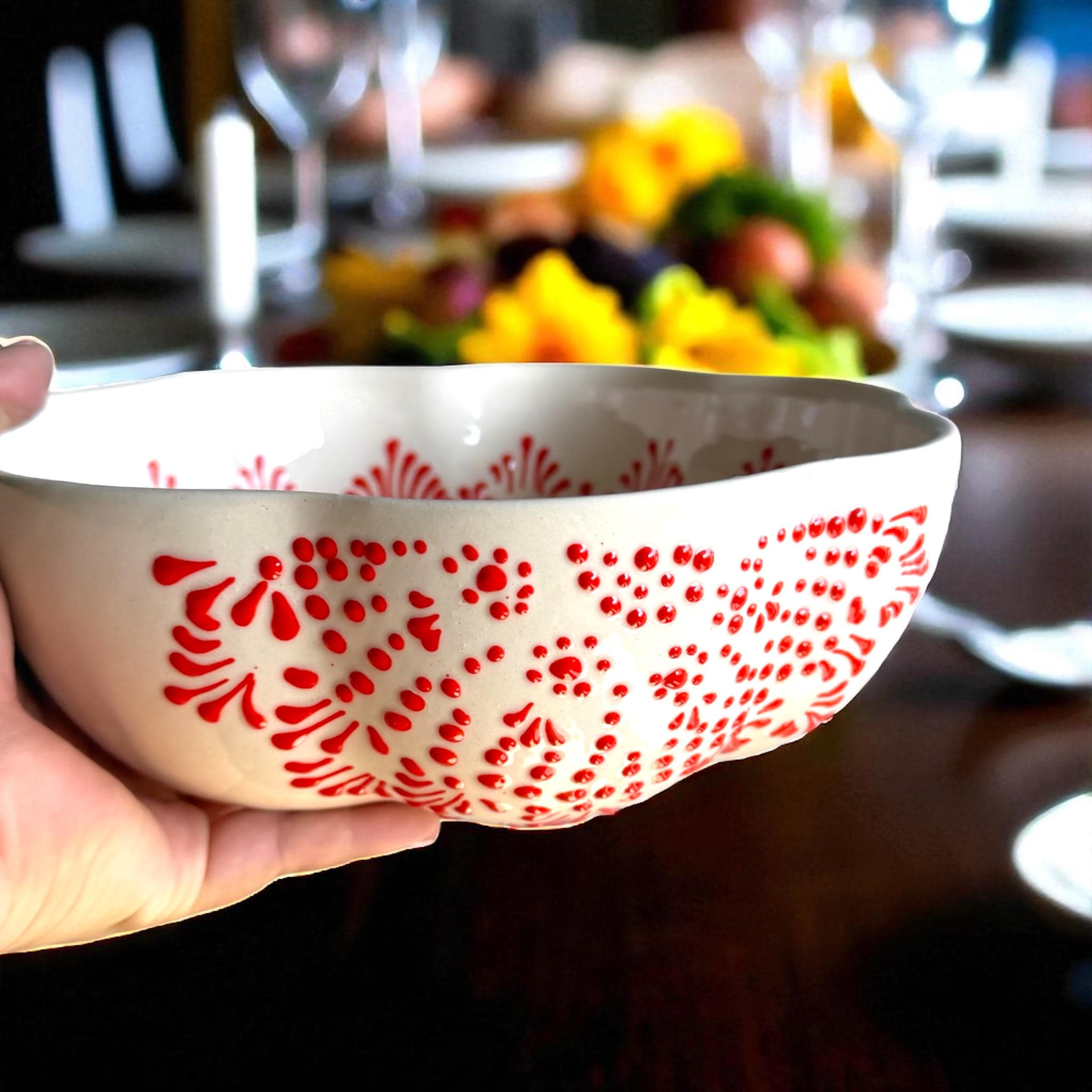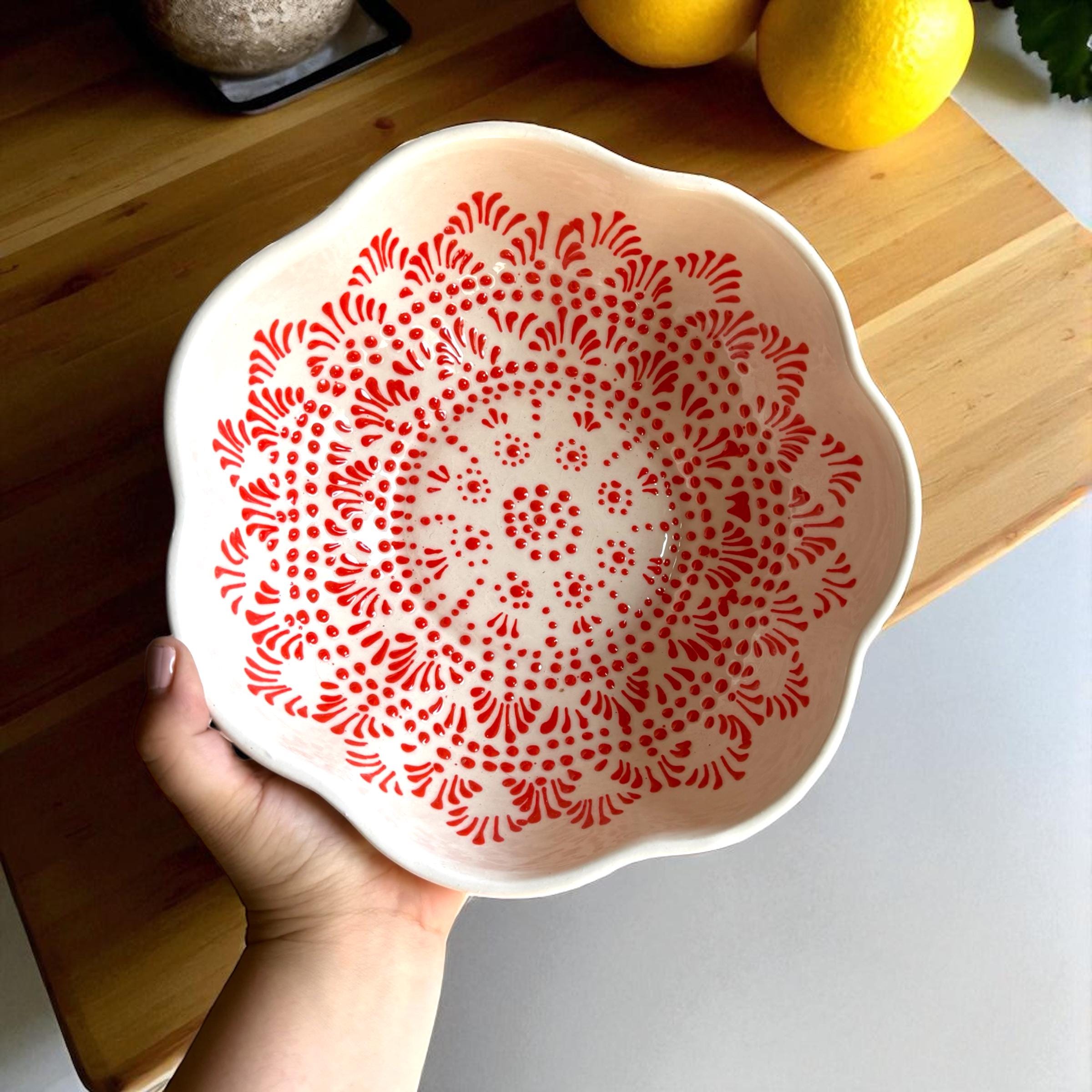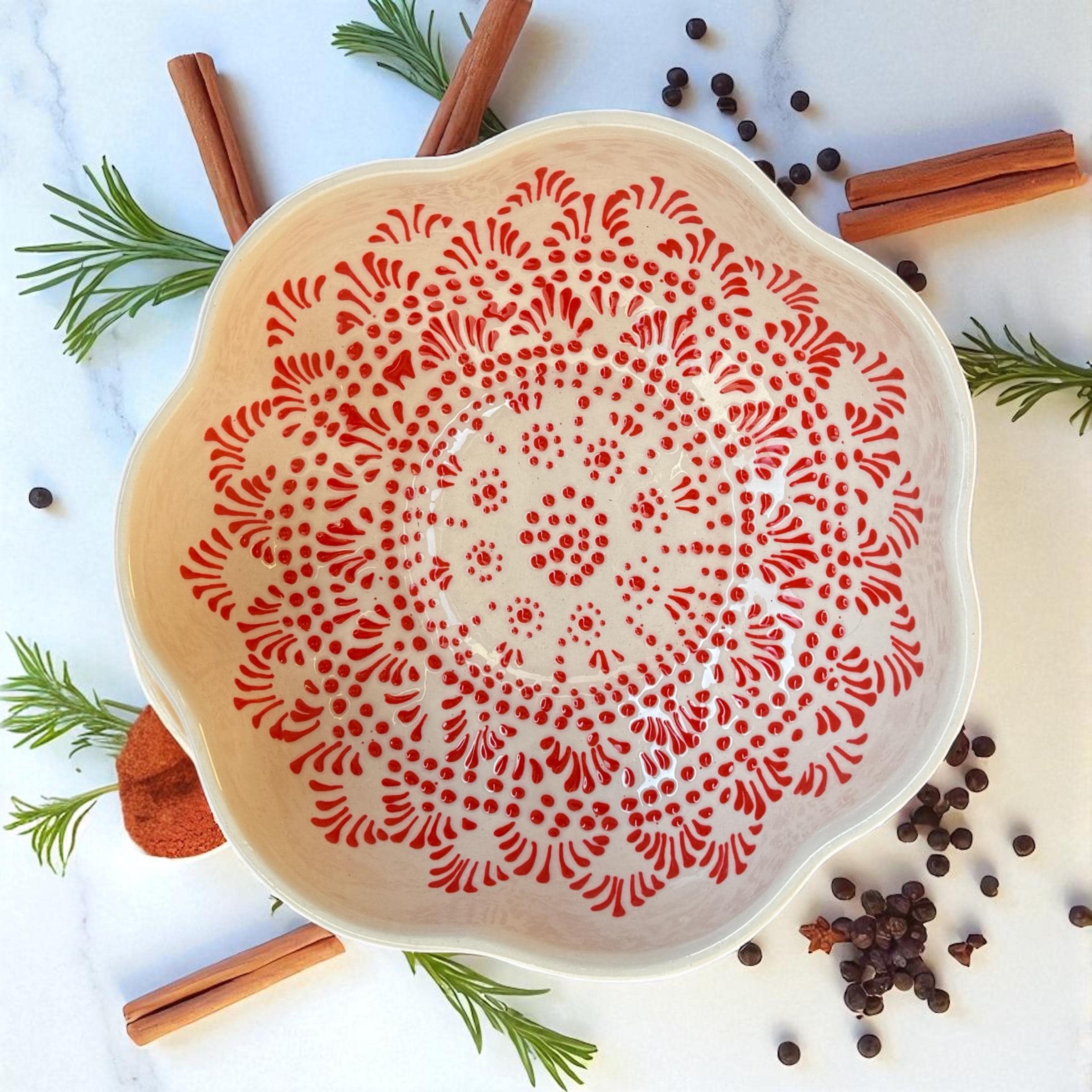Feast your eyes on this exquisite scalloped shaped bowl, adorned with a captivating mix of geometric and floral mandala pattern with elevated texture in a bright red.