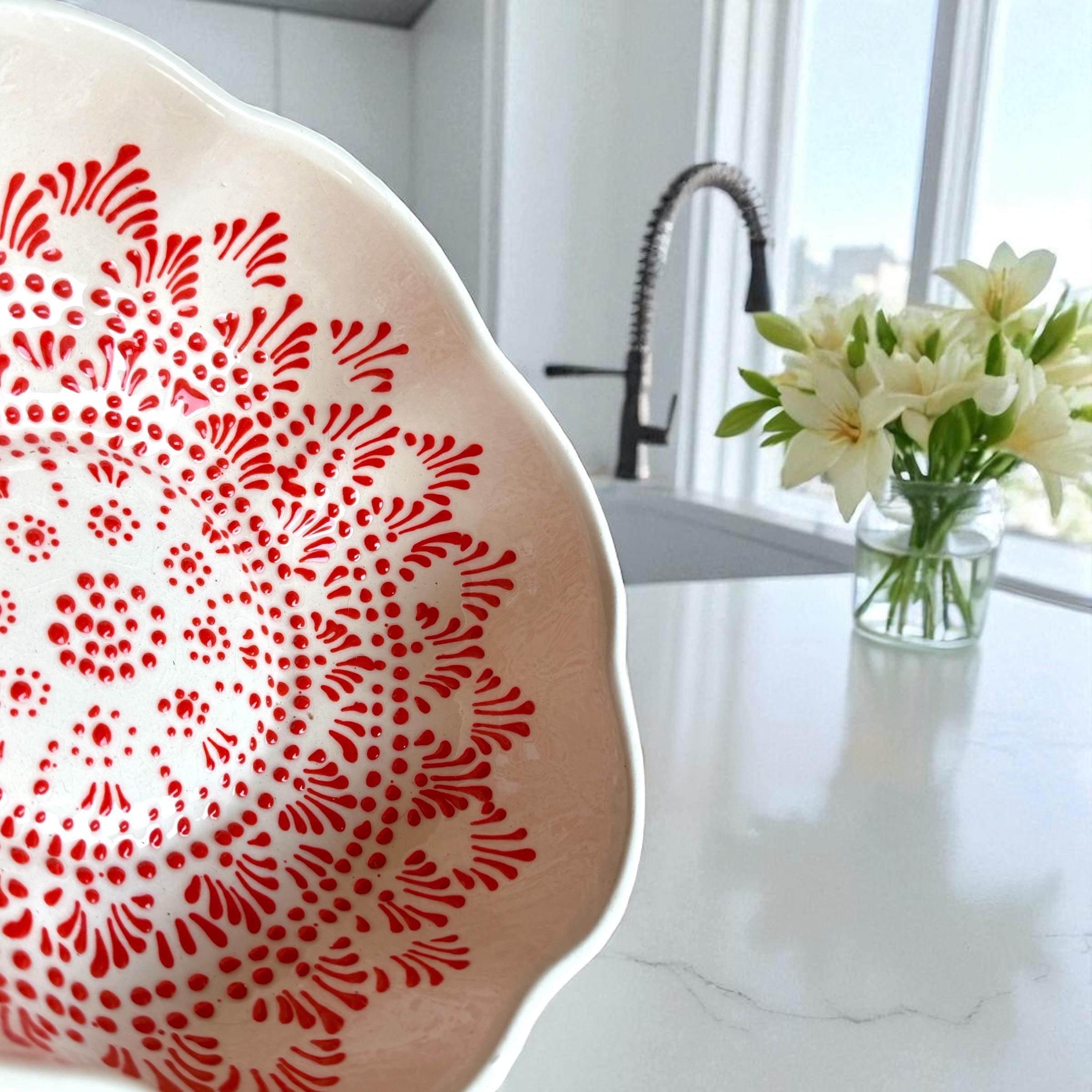 Scalloped Red Mandala Pattern Ceramic Talavera Serving Platter Kitchenware Pottery