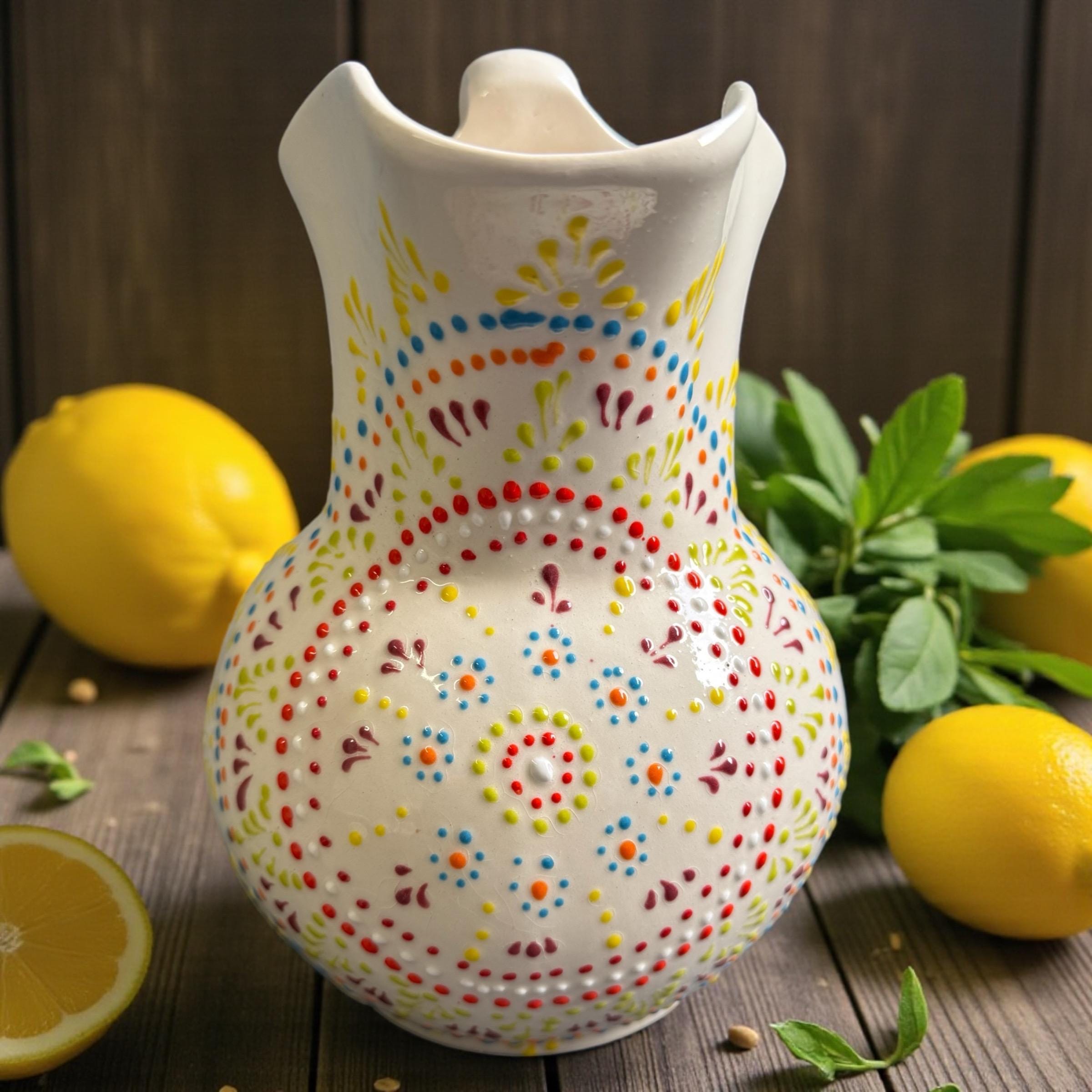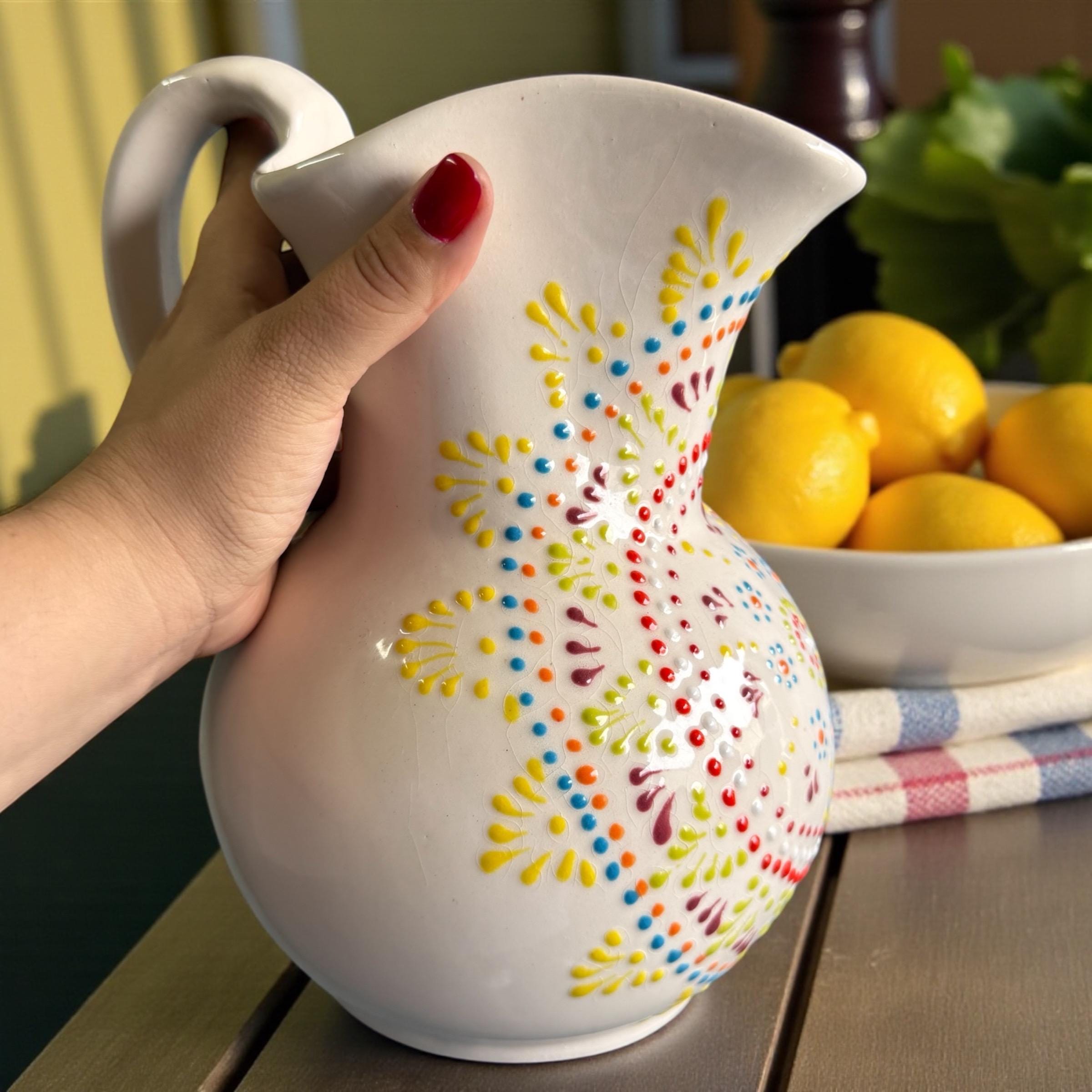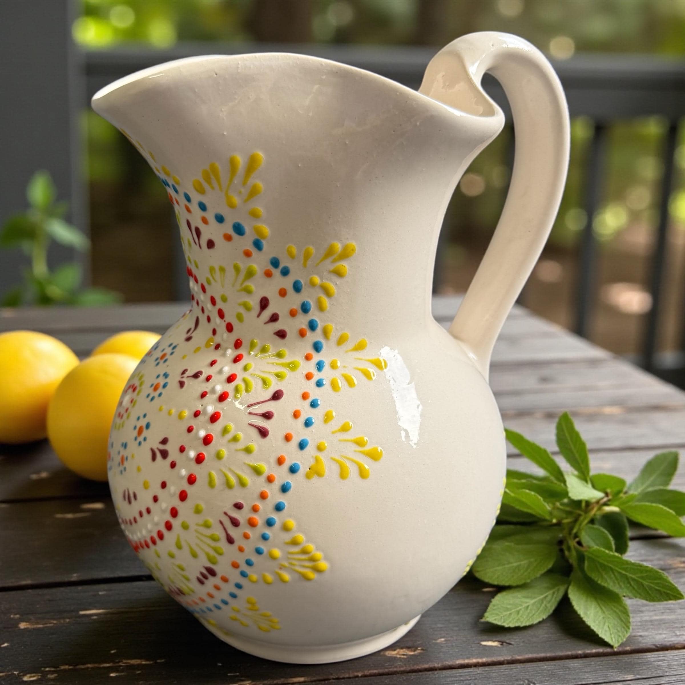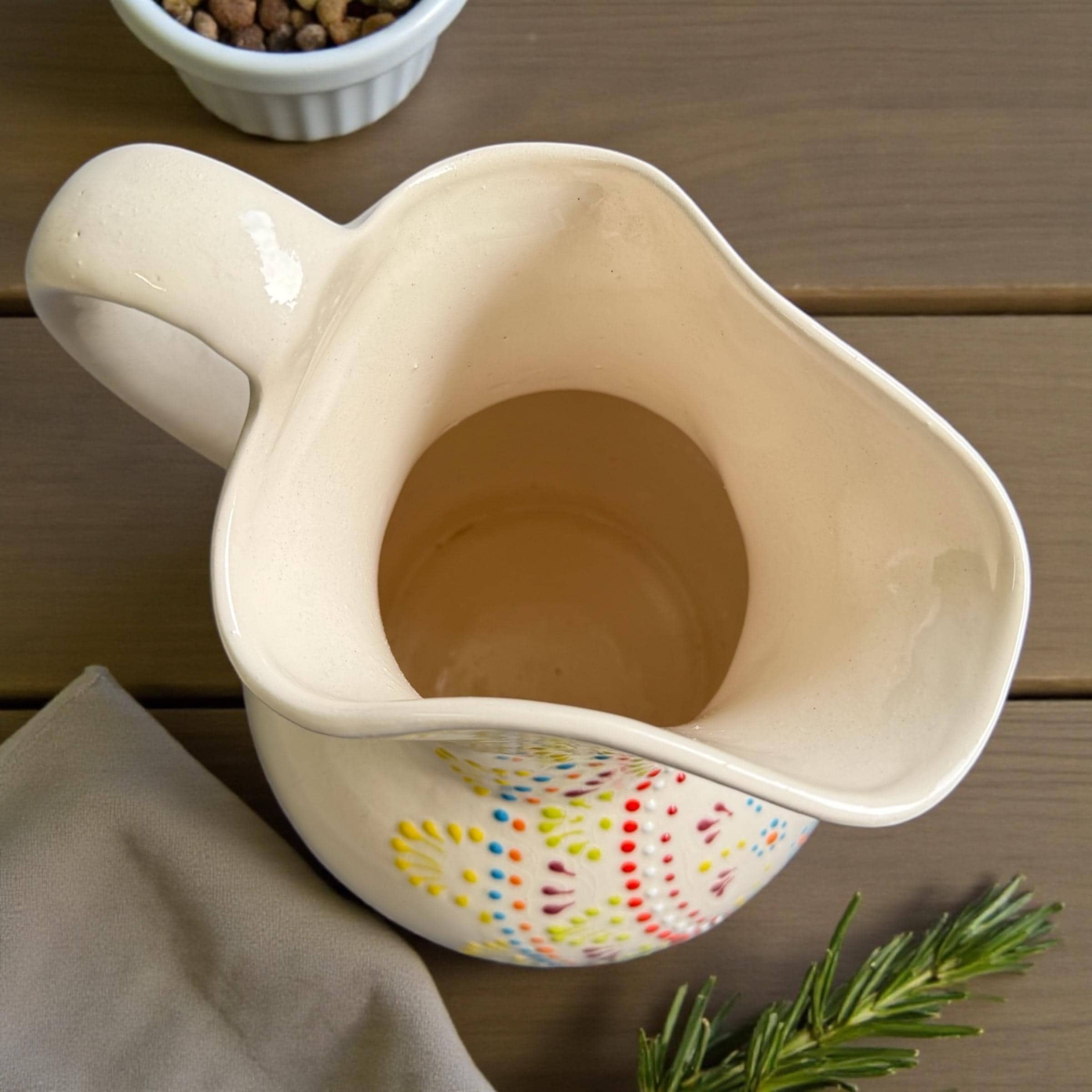 Graceful flowers and geometric patterns emboss our Talavera Ceramic Water Pitcher with a glossy glaze finished.