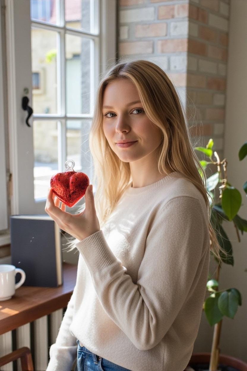 -Model is holding the largest heart on the main picture of the listing.