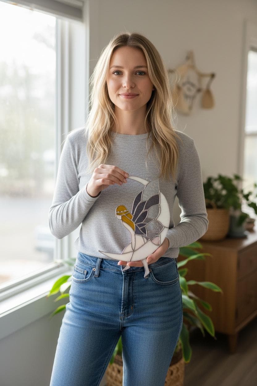 This beautiful suncatcher window ornament is perfect to add a touch of mystical and magical fairytale air for any window corner. Is one of our largest format sun catchers but has delicate color selection to enhance the illusion of a fairy sitting on the side on a moon.