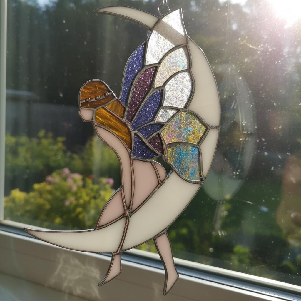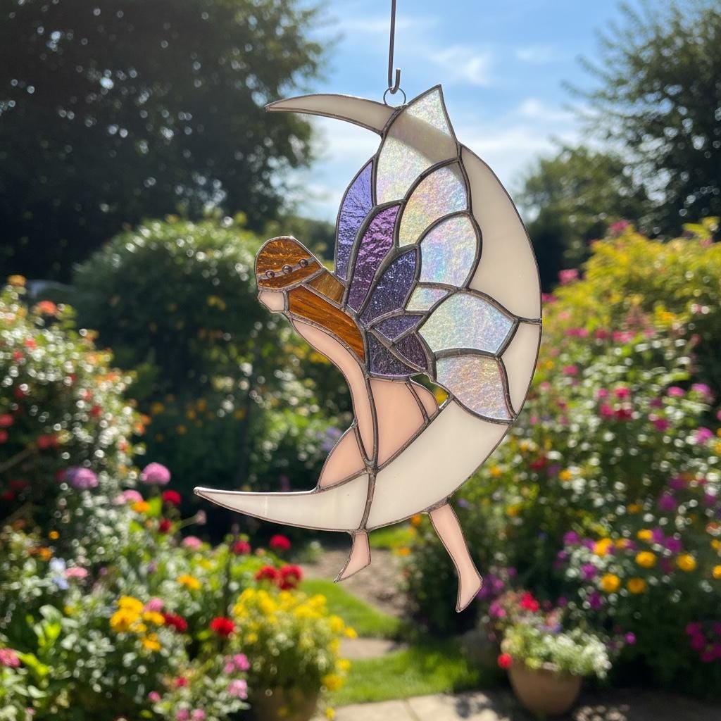 NEW Large Fairy sitting on the Moon Stained Glass Window Sun catcher Garden and Patio Decor