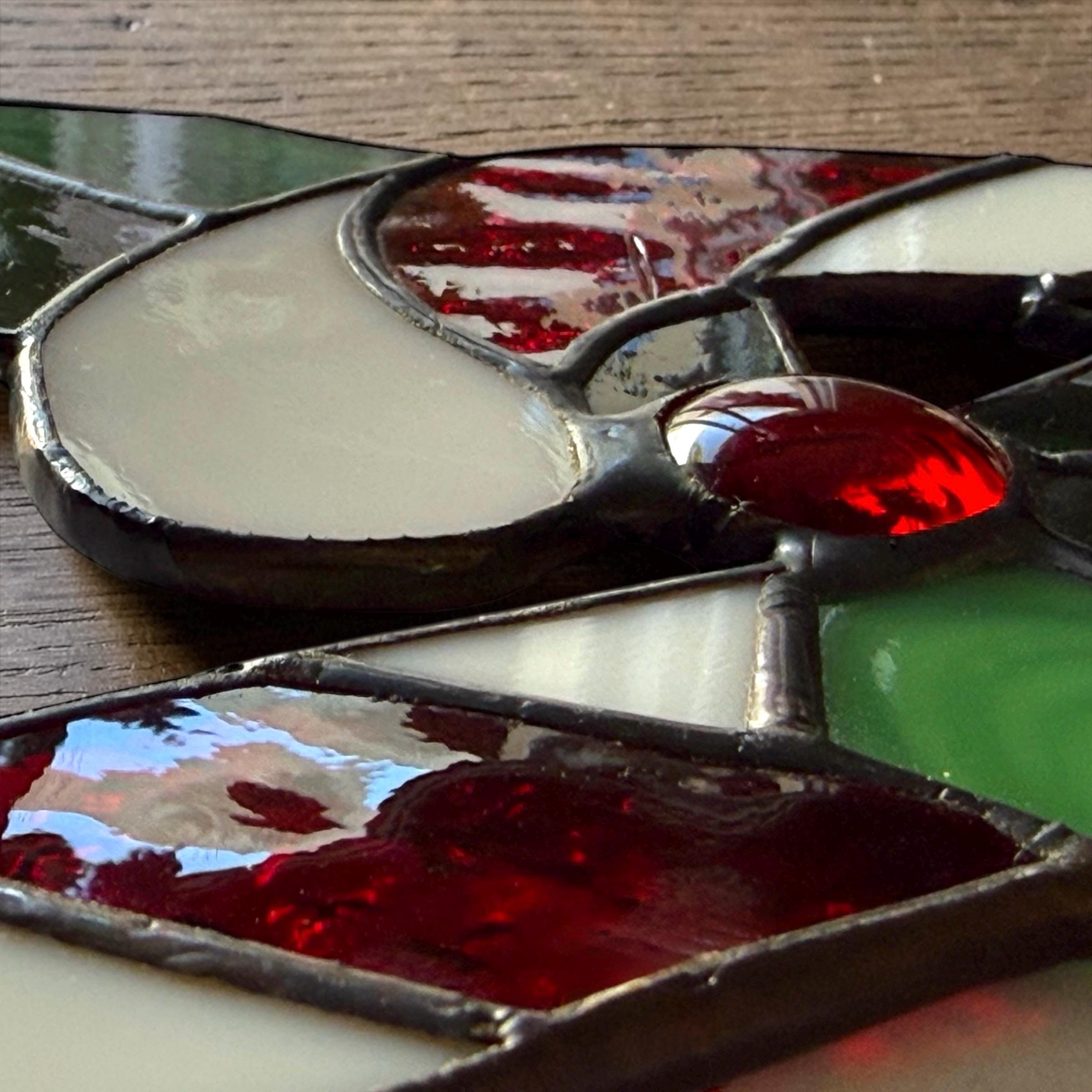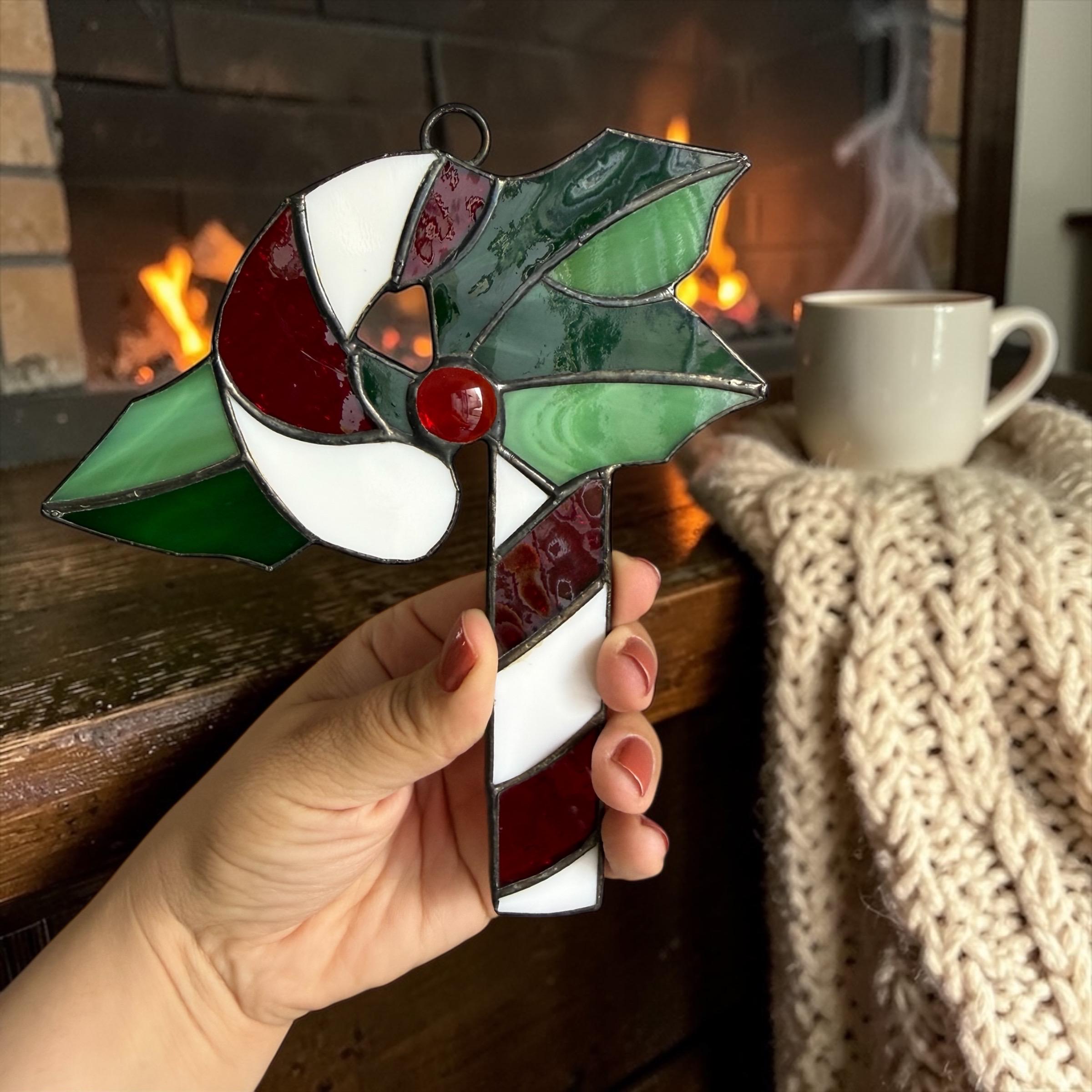 The suncatcher is made of real stained glass featuring a Mistletoe and a Candy Cane using a tiffany glass method technique.