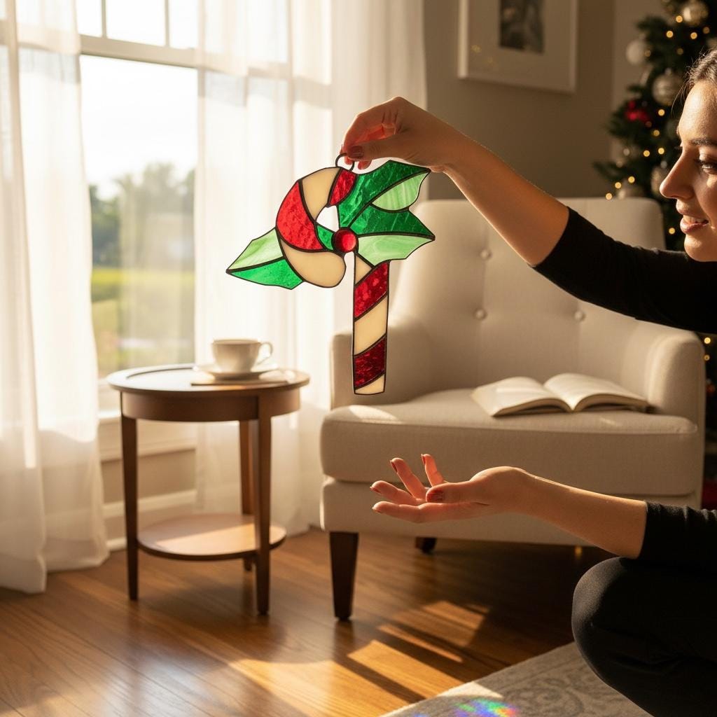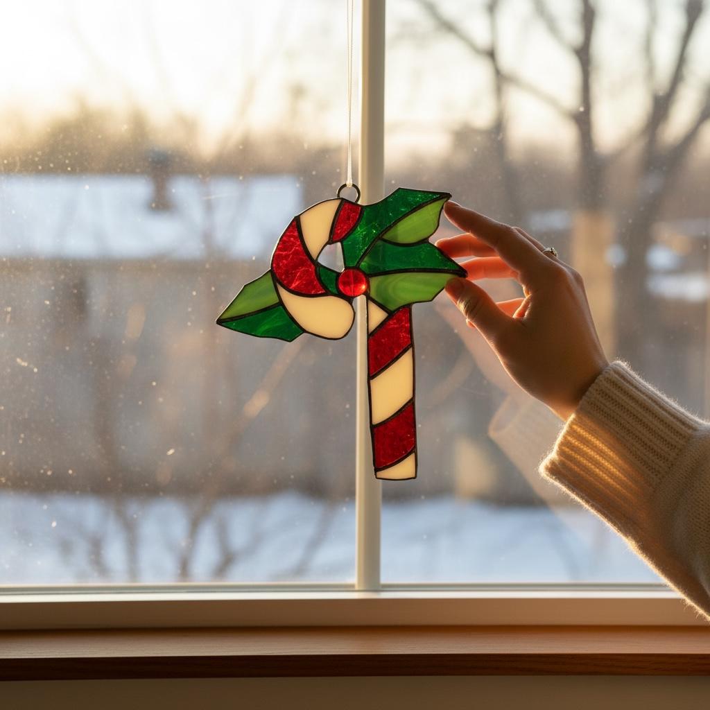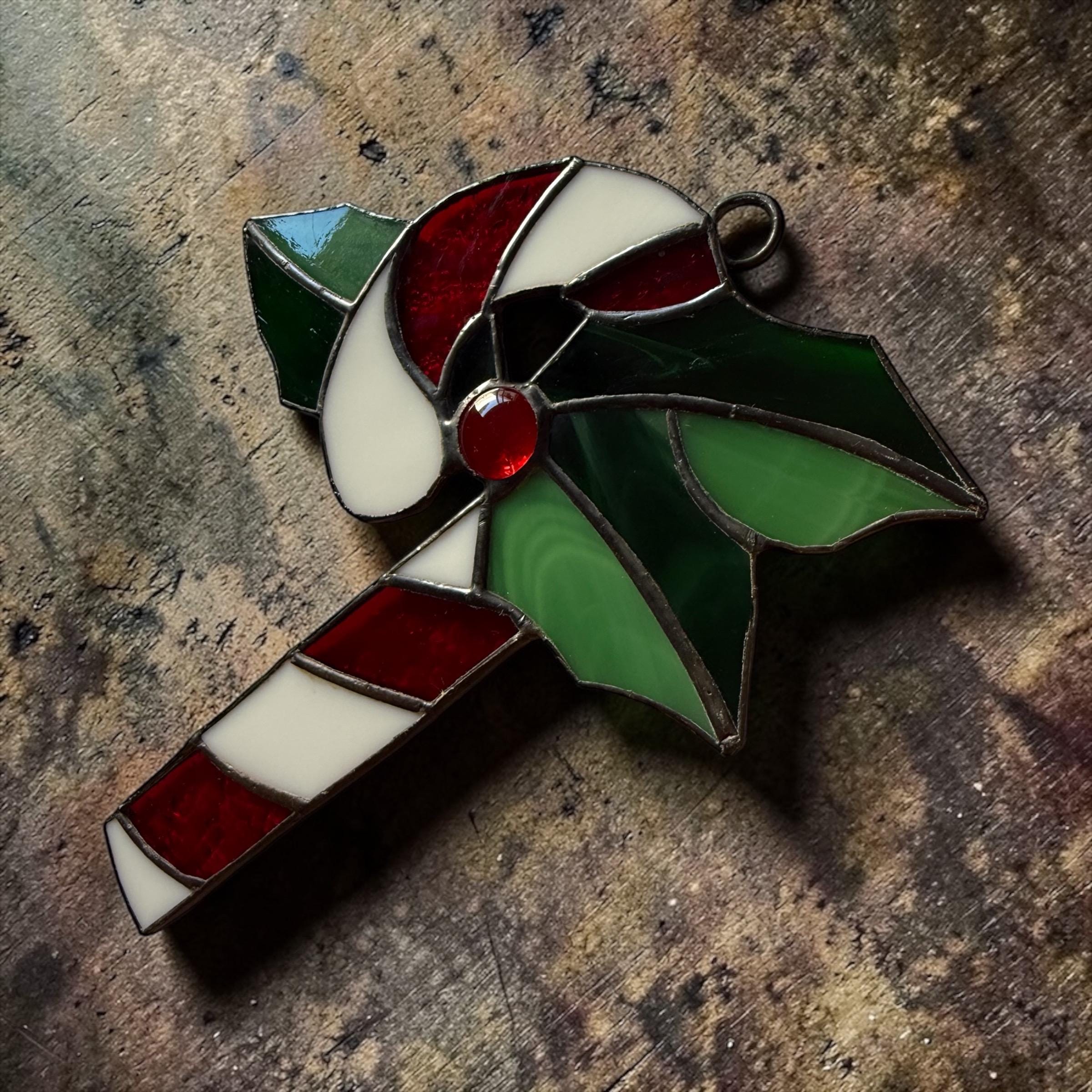 Candy Cane and Mistletoe Christmas Stained Glass Window Suncatcher