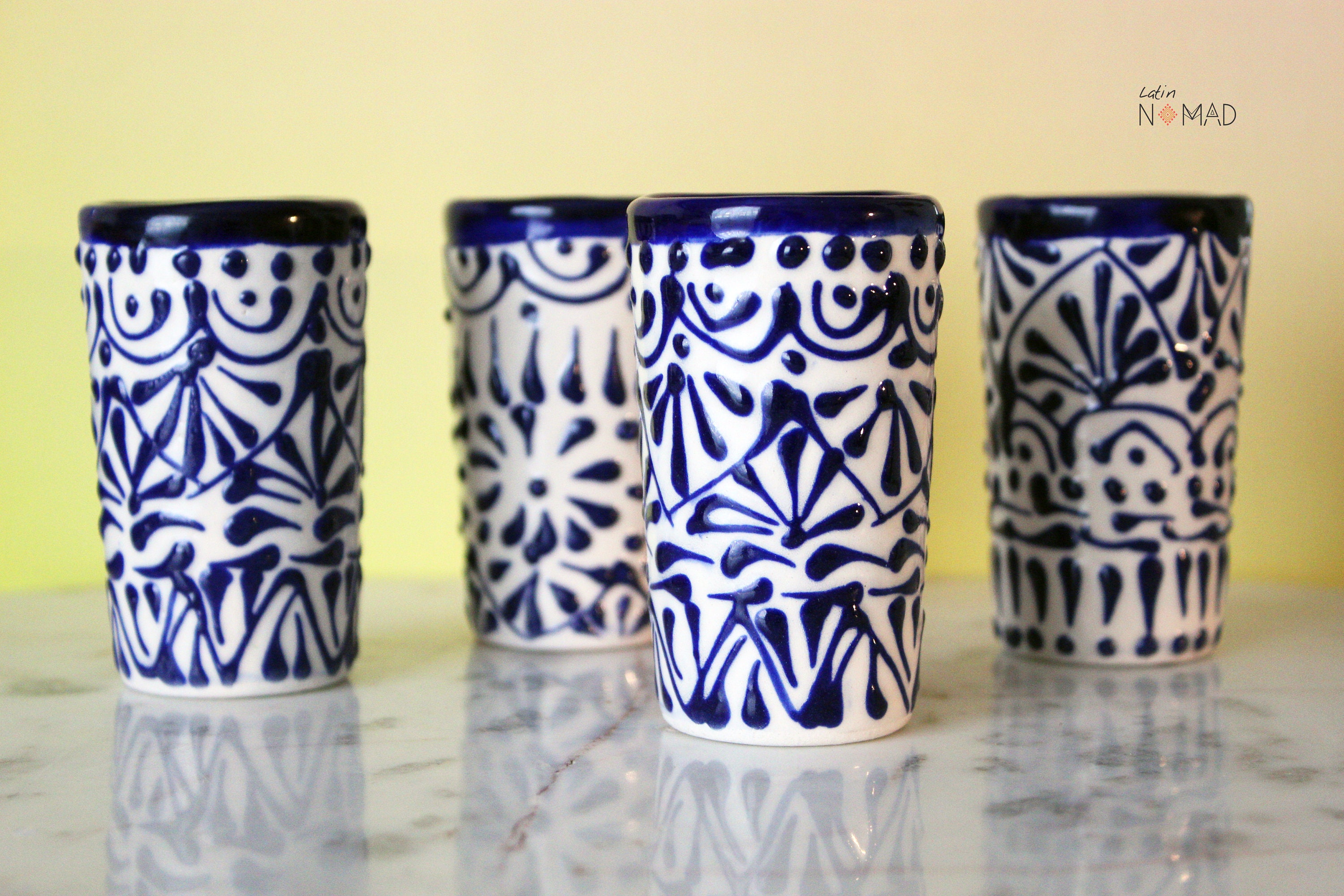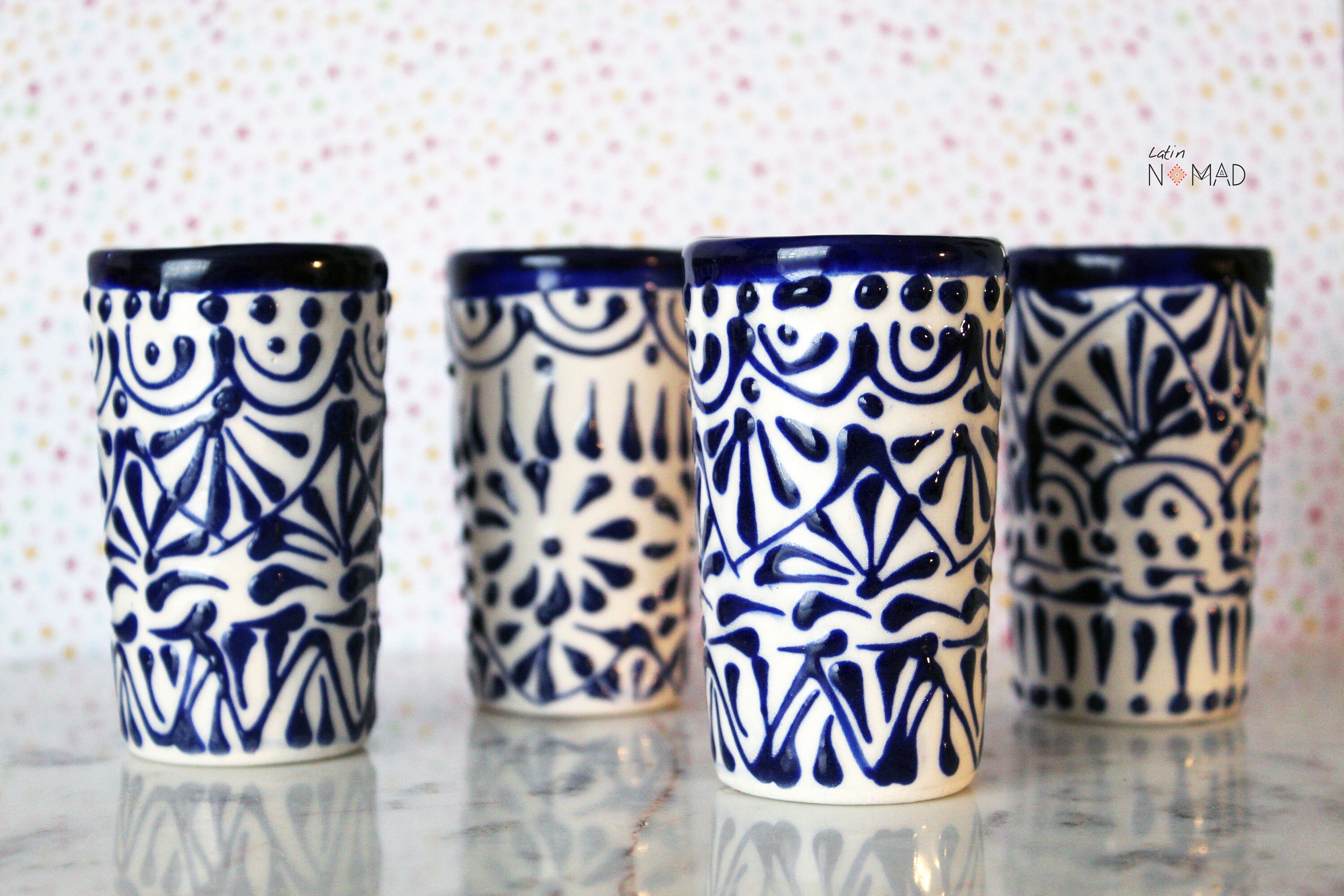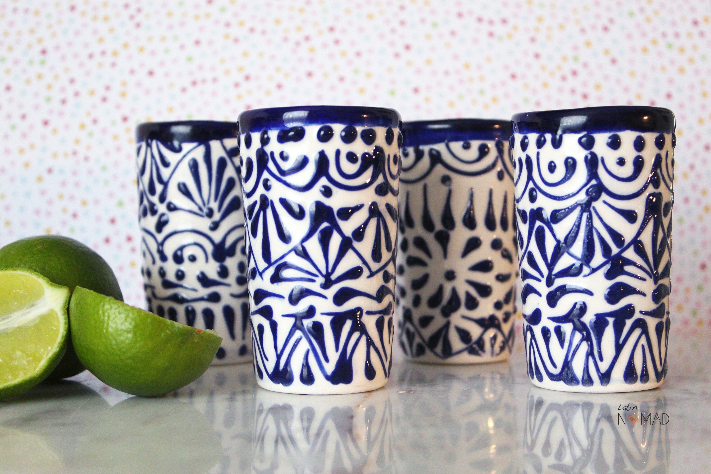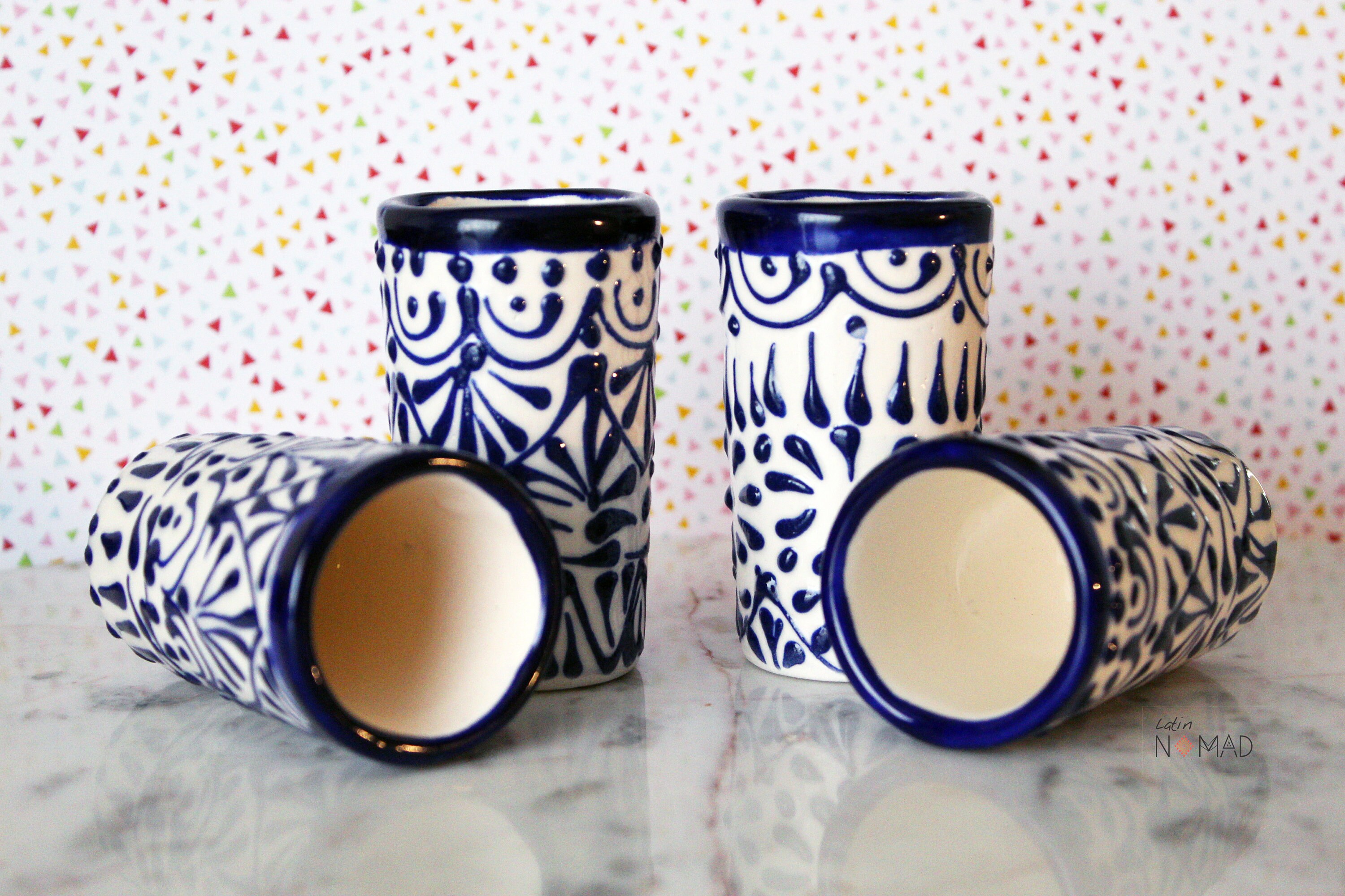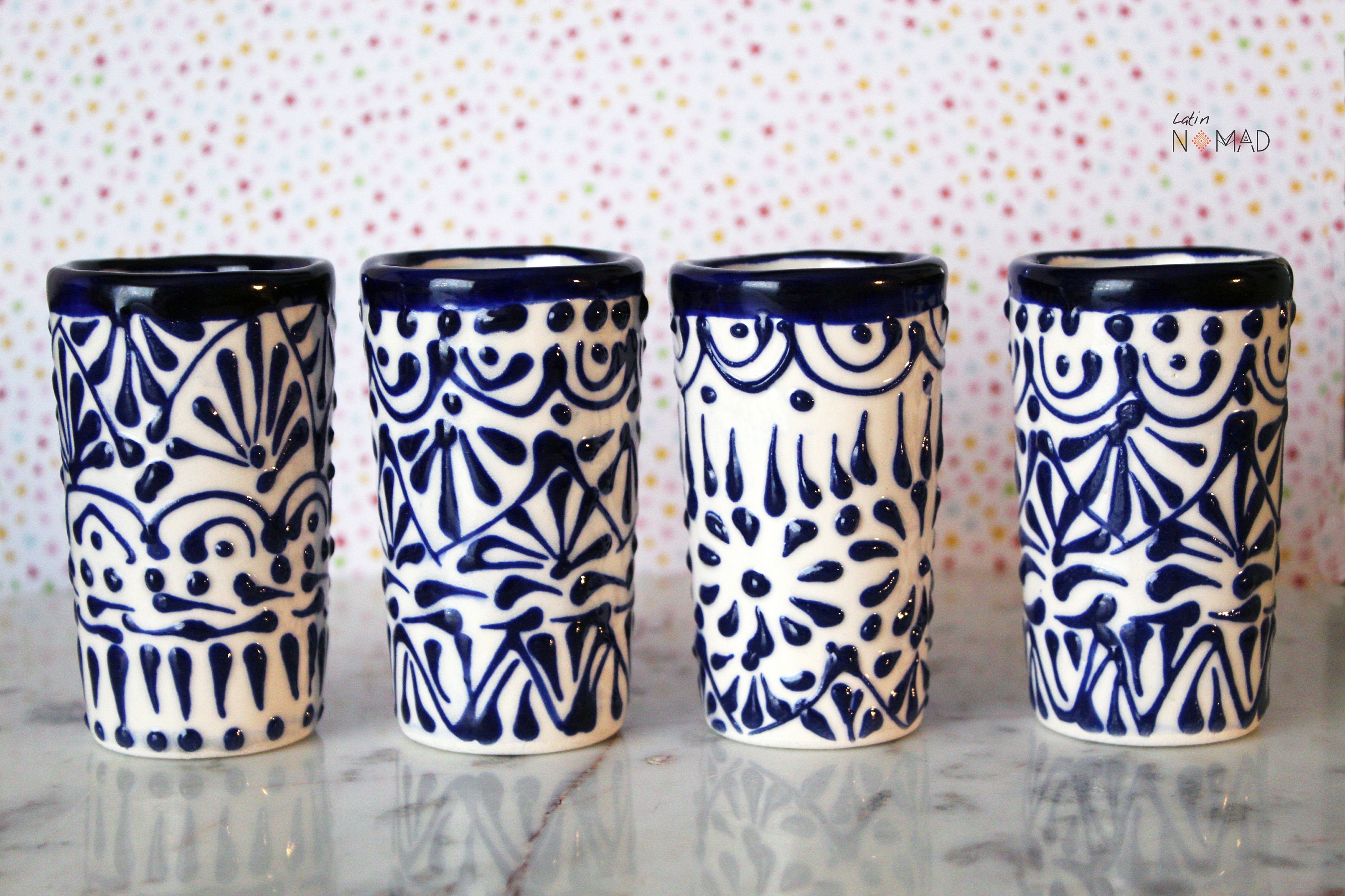 Ceramic Talavera Tequila Shot Glass / White and Blue Mexican Drinkware by Latin Nomad.